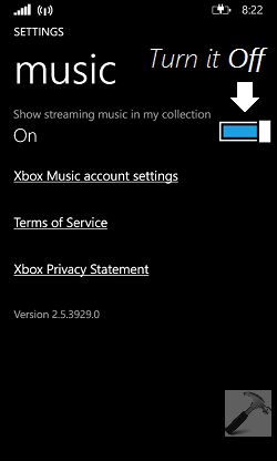 3. Finally, in the below shown SETTINGS screen for Music app, turn Off the option Show streaming music in my collection.