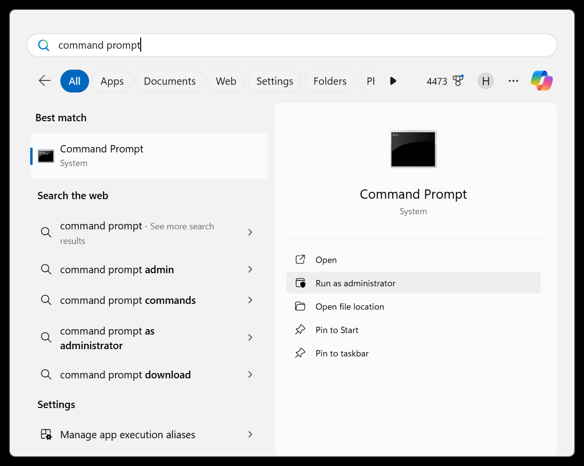 1. Search Windows for cmd and run it as administrator.