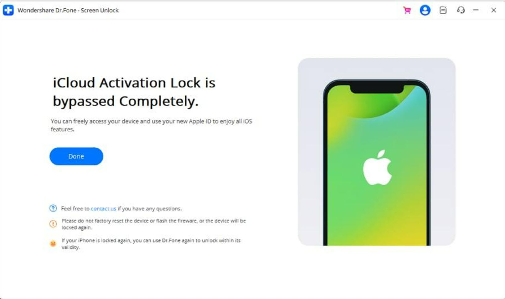 Step 3: After the iCloud activation lock is bypassed, click Done to close Dr.Fone – Screen Unlock (iOS).