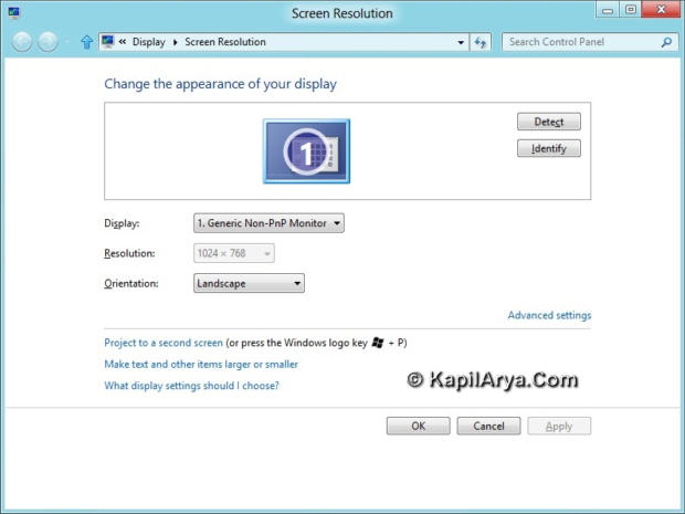 6. Exit Registry Editor and reboot. After reboot, right-click on desktop and select Screen Resolution. Now you can select resolution of 1024 x 768 or higher. Whatever it is but you can run the Metro Apps at low resolution.
